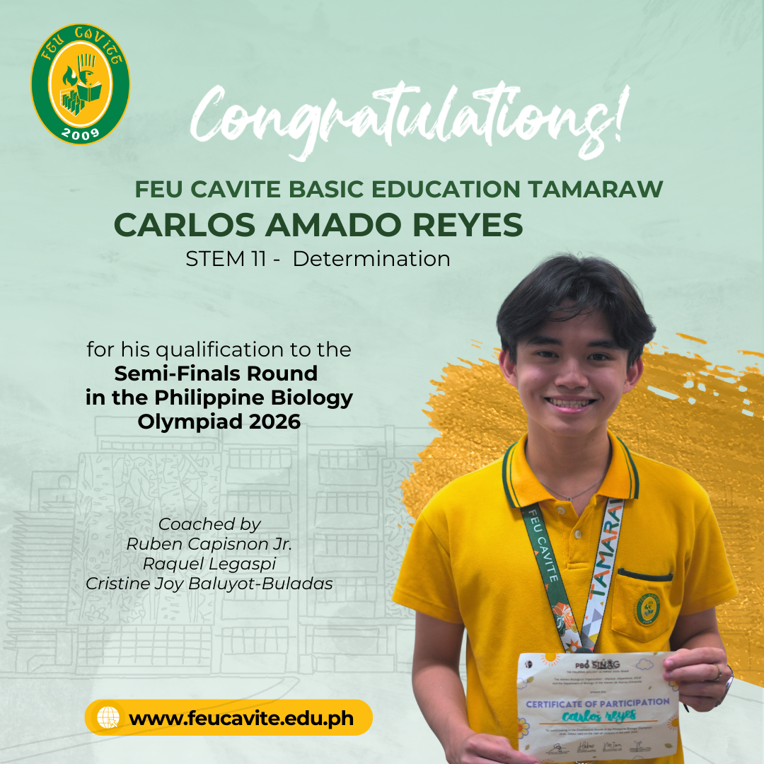 Our very own Carlos Amado Reyes, from Grade 11 STEM Determination, conquered the Eliminations by being one of the Top 55 Semi-Finalists in the Philippine Biology Olympiad 2026. Carlos took the Eliminations at the Ateneo de Manila University, together with 724 participants across the country at different Satellite Testing Centers, last January 24, 2026. The Elimination Round, consisting of Theoretical and Practical Examinations, challenged their knowledge in collegiate-level biology concepts.