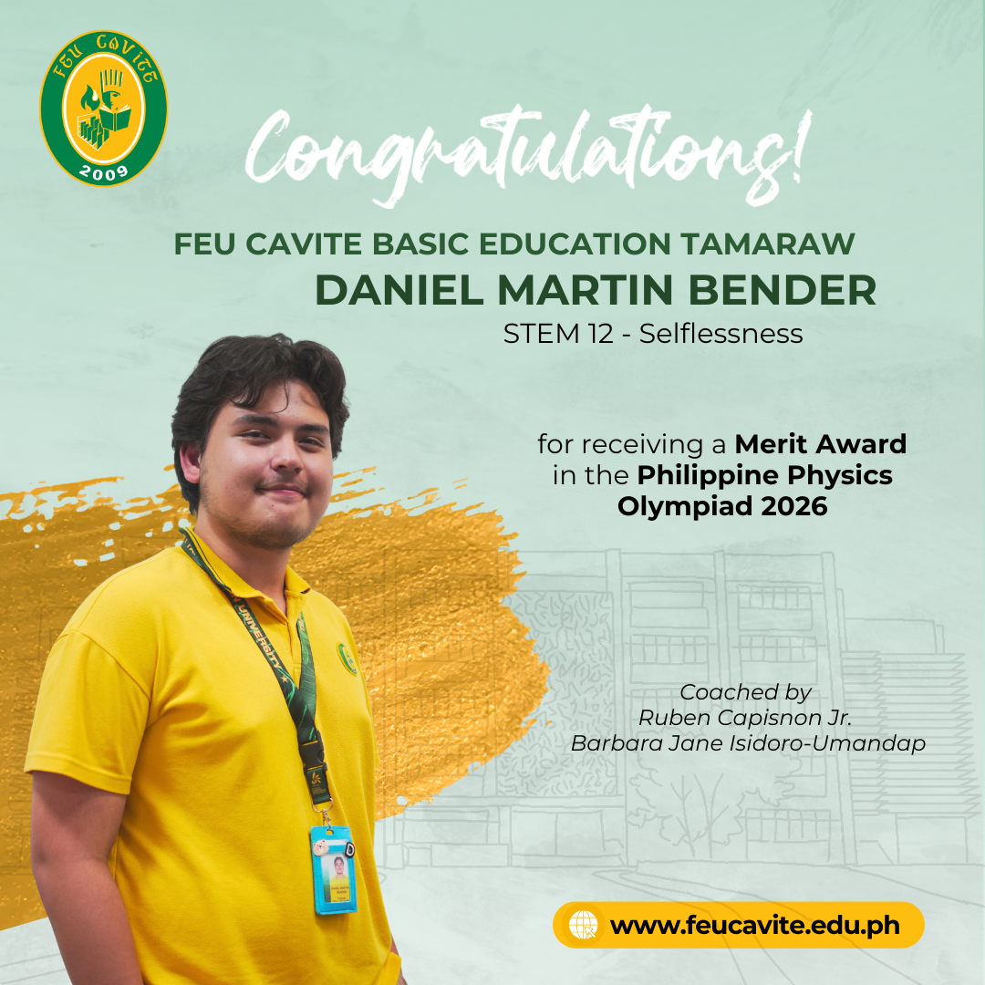 Two of our FEU Cavite Tamaraws, Daniel Martin Bender and Kaleb Modesto, from Grade 12 STEM Selflessness, were among the 143 Qualifying Round Merit Awardees from the Philippine Physics Olympiad 2026. This citation is awarded to contestants who score higher than the 70th percentile in the PPO Qualifying Round. Daniel and Kaleb were among the 627 Qualifying Contestants who took the exam at the National Institute of Physics, University of the Philippines Diliman, last January 24, 2026. The three-hour exam comprised of different test types, ranging from multiple-choice, fill-in-the-blanks to open-response, covered General Physics topics.