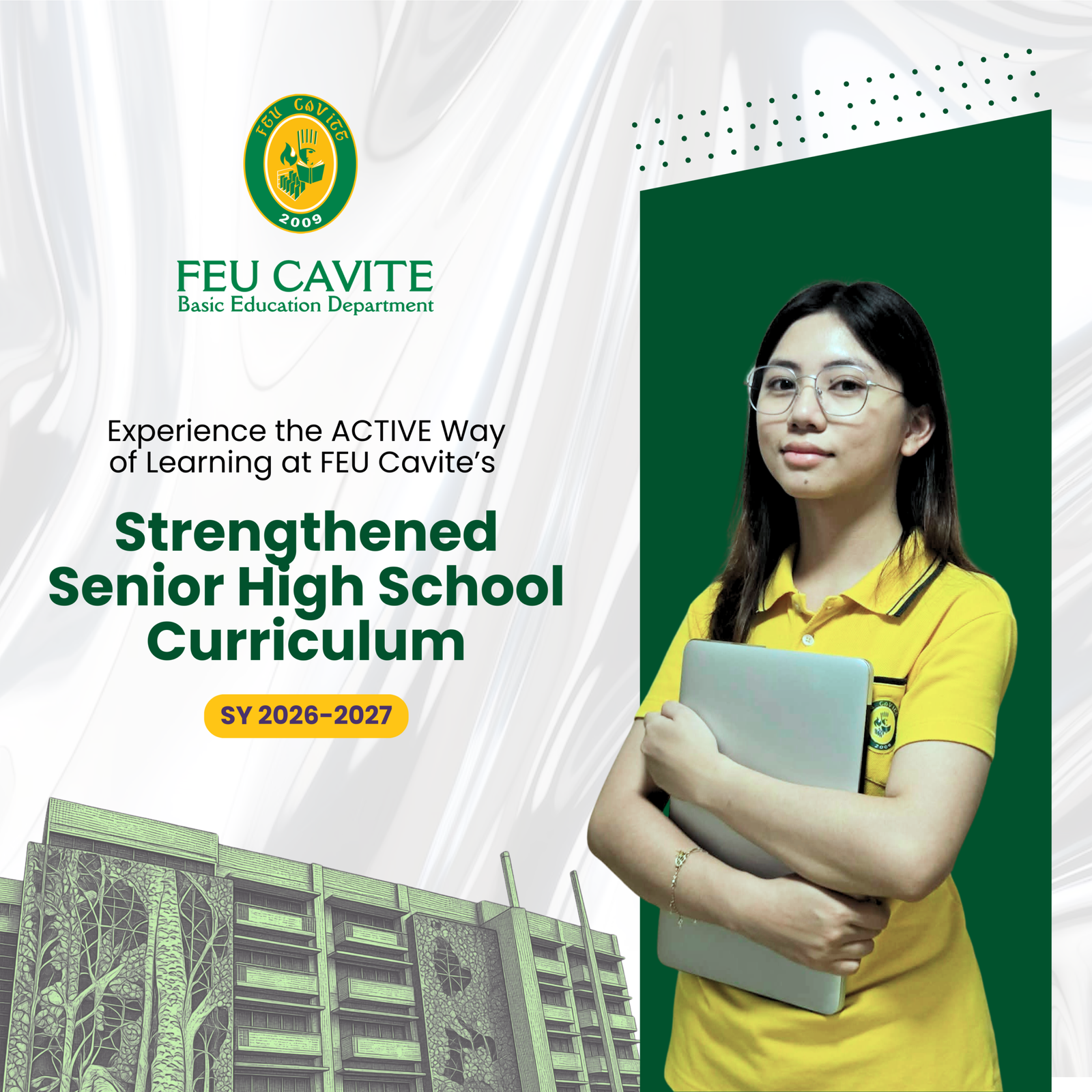 The Senior High School (SHS) Curriculum of FEU Cavite, aligned with the Department of Education’s Strengthened SHS framework, is designed to develop learners who are academically prepared, values-driven, and future-ready. As a PAASCU Level 1 Accredited institution, FEU Cavite ensures that its programs meet recognized standards of quality and continuous improvement. Grounded in The ACTIVE Way of Learning, the program emphasizes experiential, student-centered, and outcomes-based education that equips learners with essential 21st-century competencies in communication, critical thinking, collaboration, and the responsible use of media and technology.