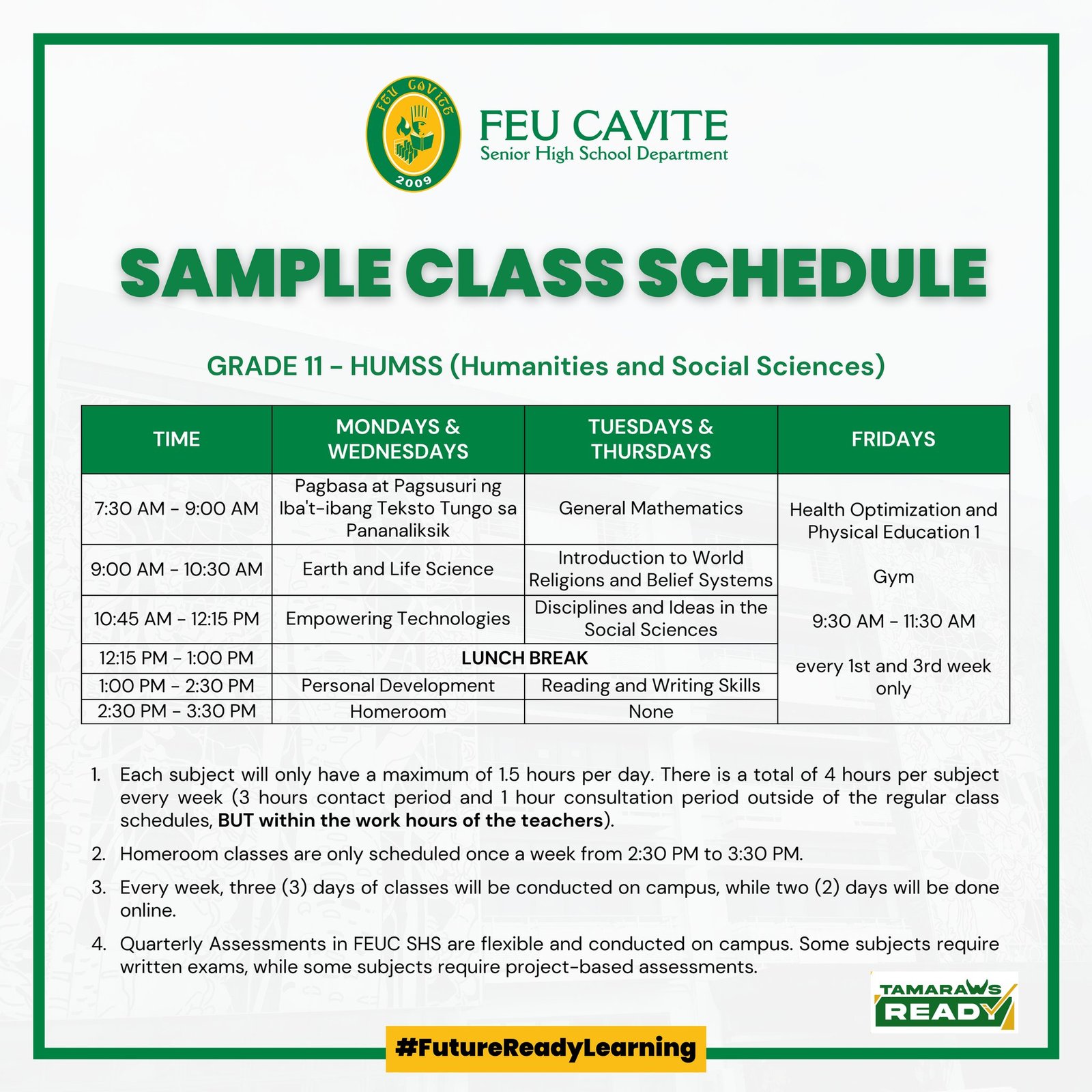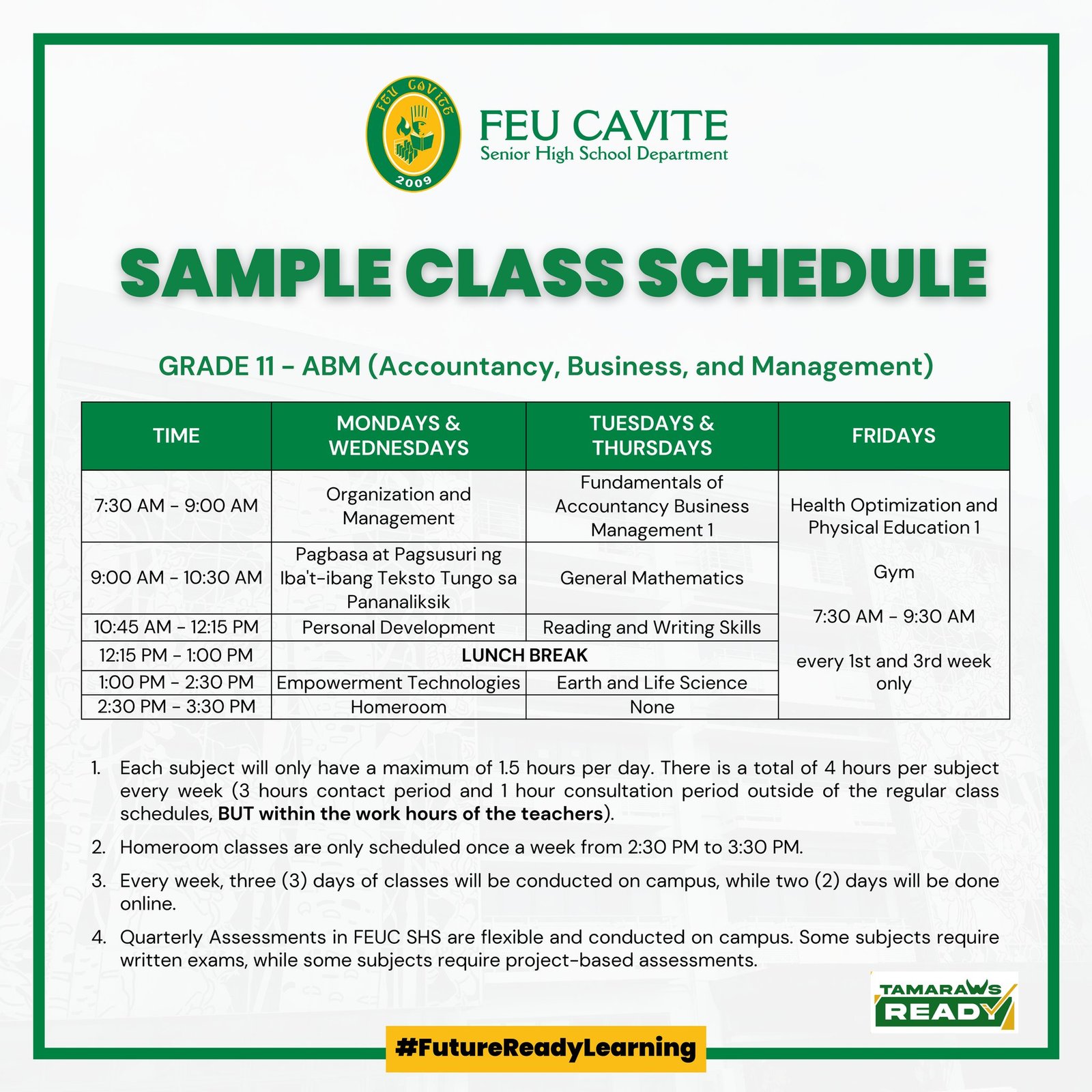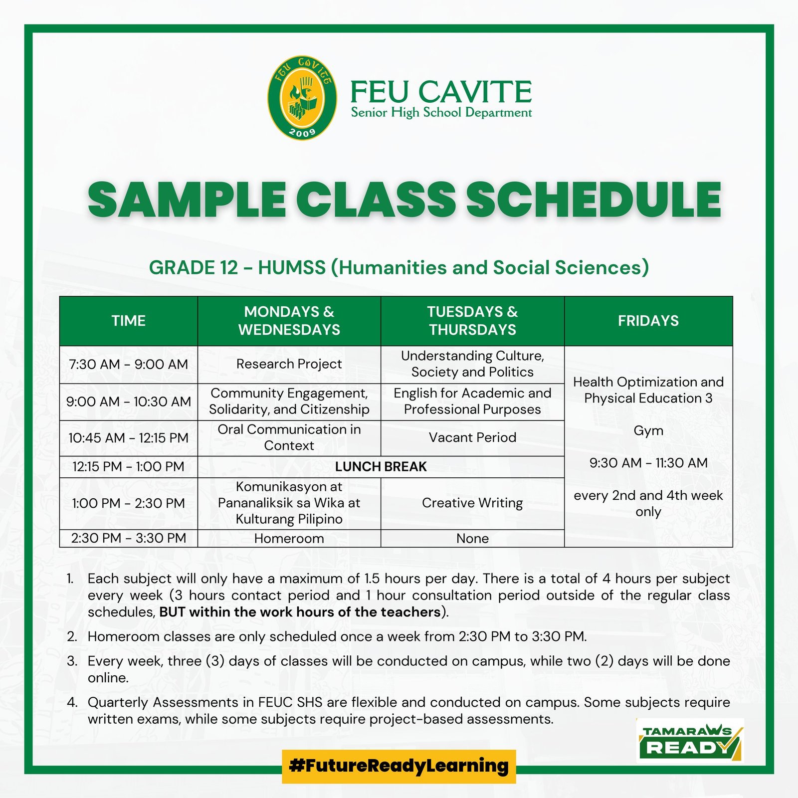 There will be regular physical classes for both Grades 11 and 12 SHS students with a whole day class schedule from 7:30 AM to 2:30 PM every week. There will be at least 3 days of physical classes and 2 days for online classes/activities. An additional one (1) hour per week will be schedule to give way to Homeroom Classes. Necessary measures shall be adopted by the school following the safety protocols presented by the IATF.