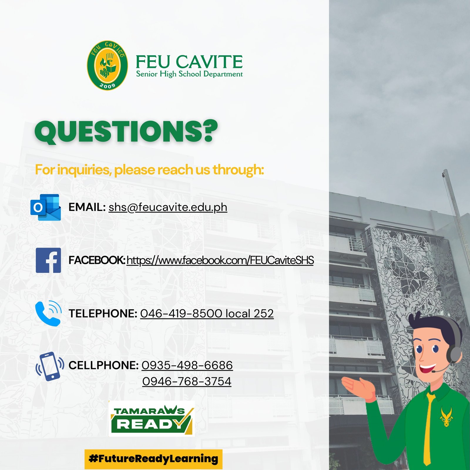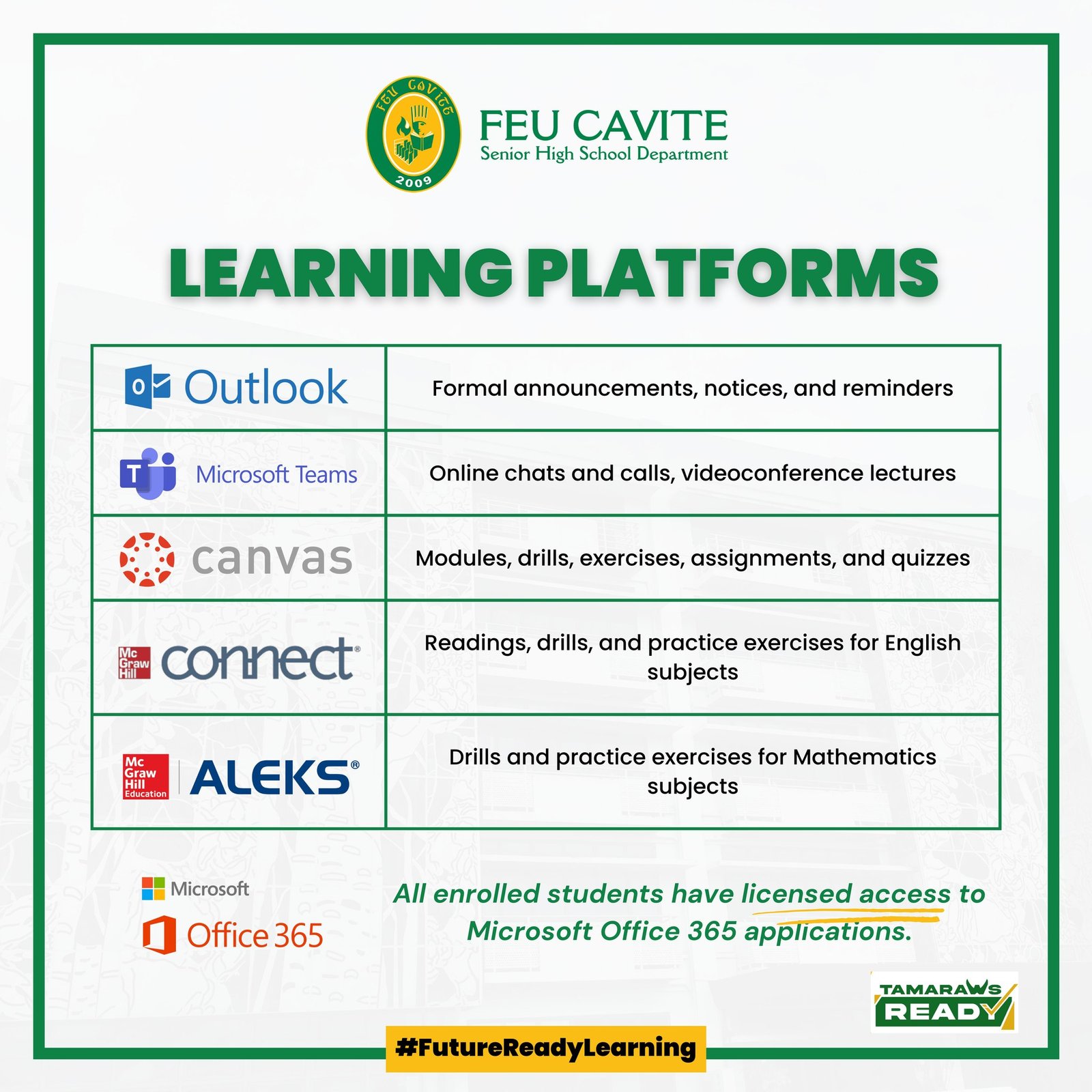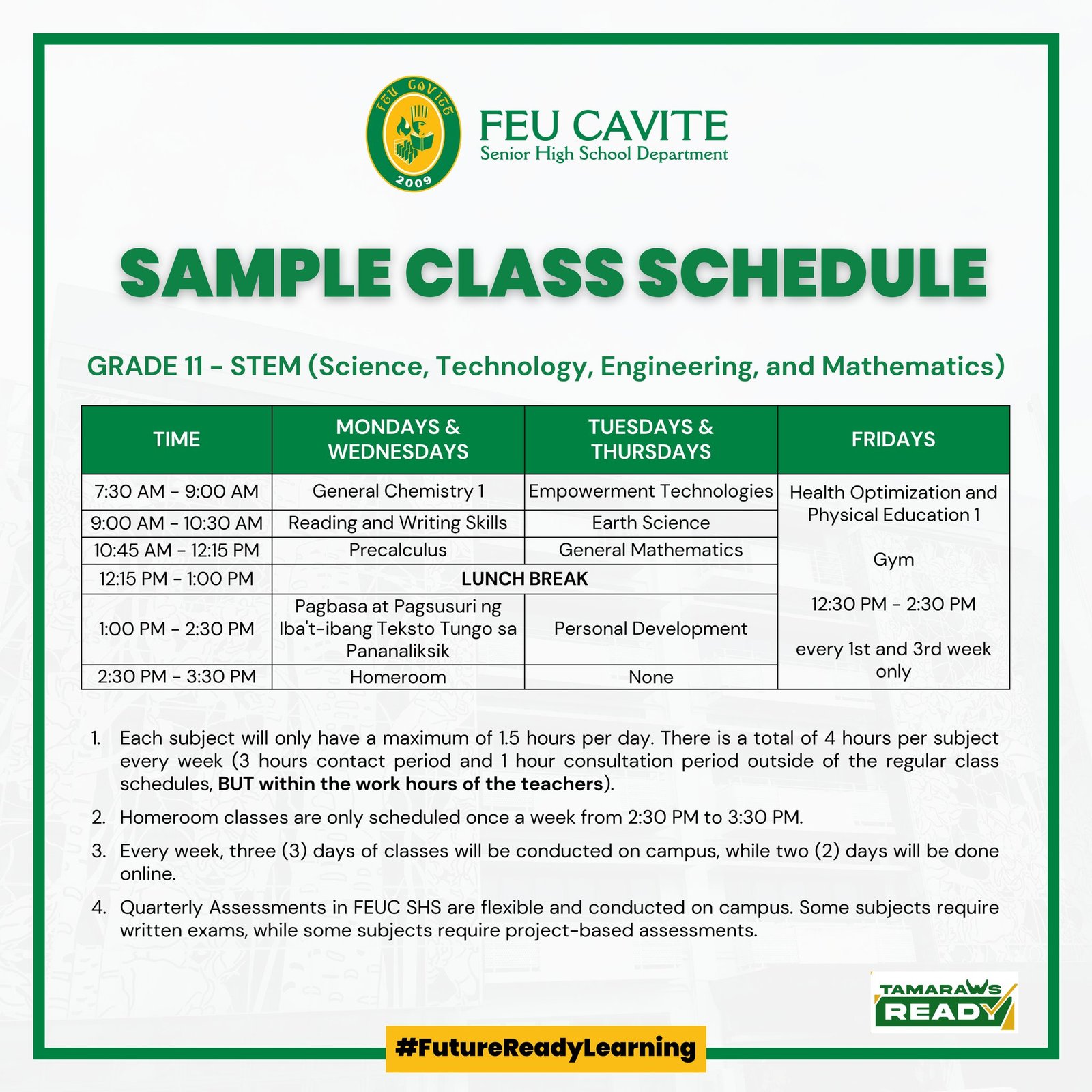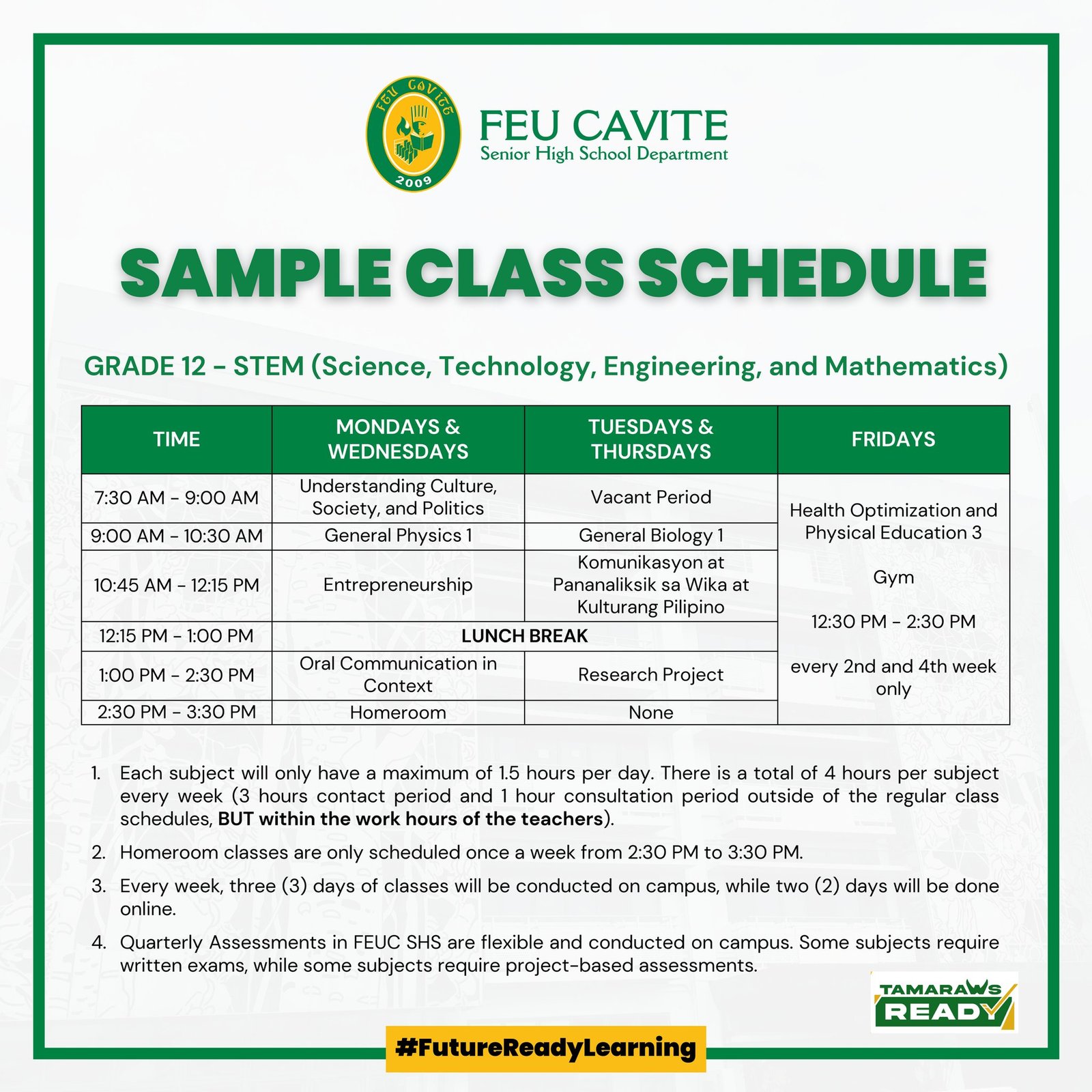 There will be regular physical classes for both Grades 11 and 12 SHS students with a whole day class schedule from 7:30 AM to 2:30 PM every week. There will be at least 3 days of physical classes and 2 days for online classes/activities. An additional one (1) hour per week will be schedule to give way to Homeroom Classes. Necessary measures shall be adopted by the school following the safety protocols presented by the IATF.